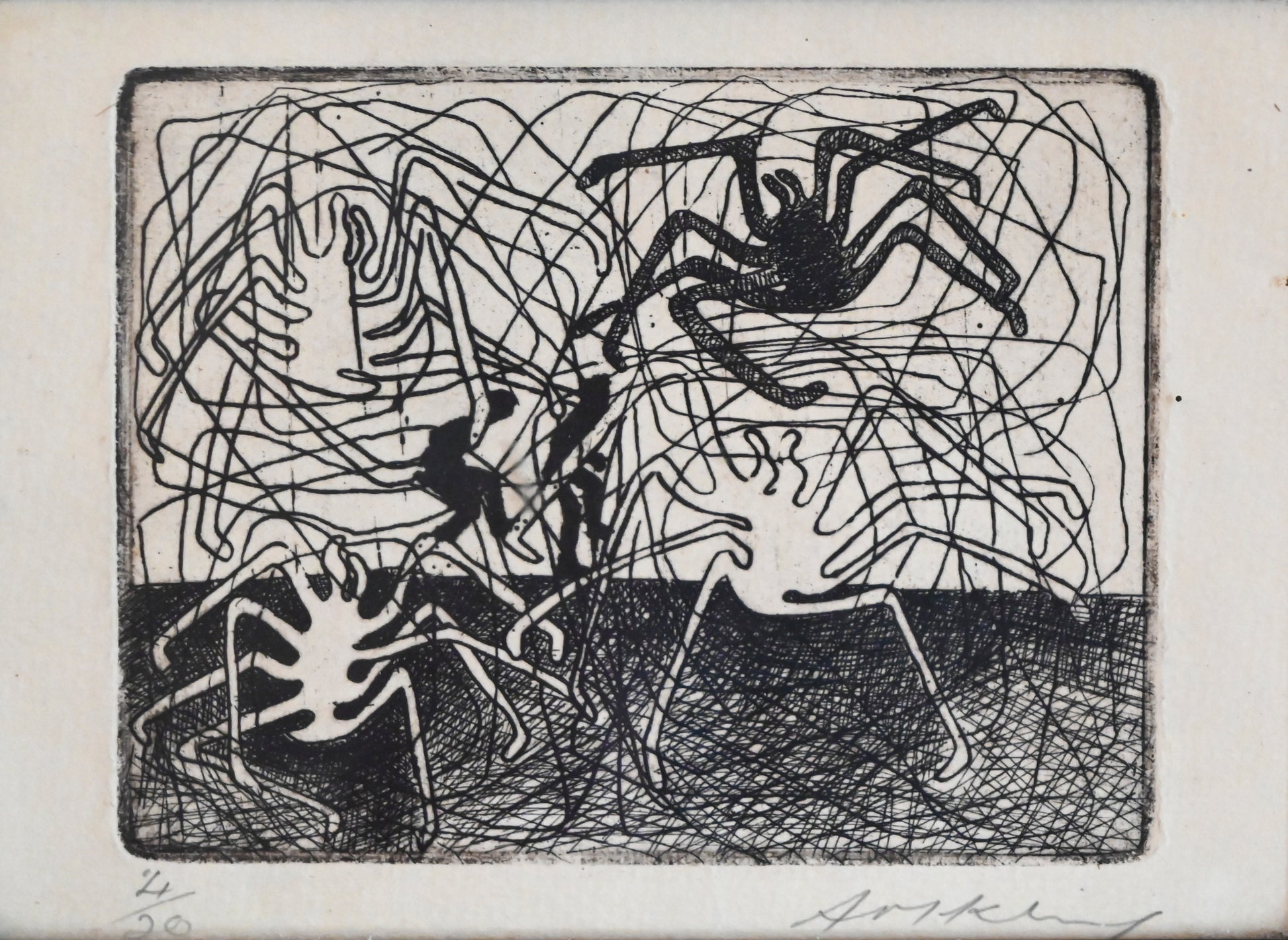 This etching was inspired by a chapter in Mervyn Peake’s novel Gormenghast. Men tiptoeing through a world of entangled webs.