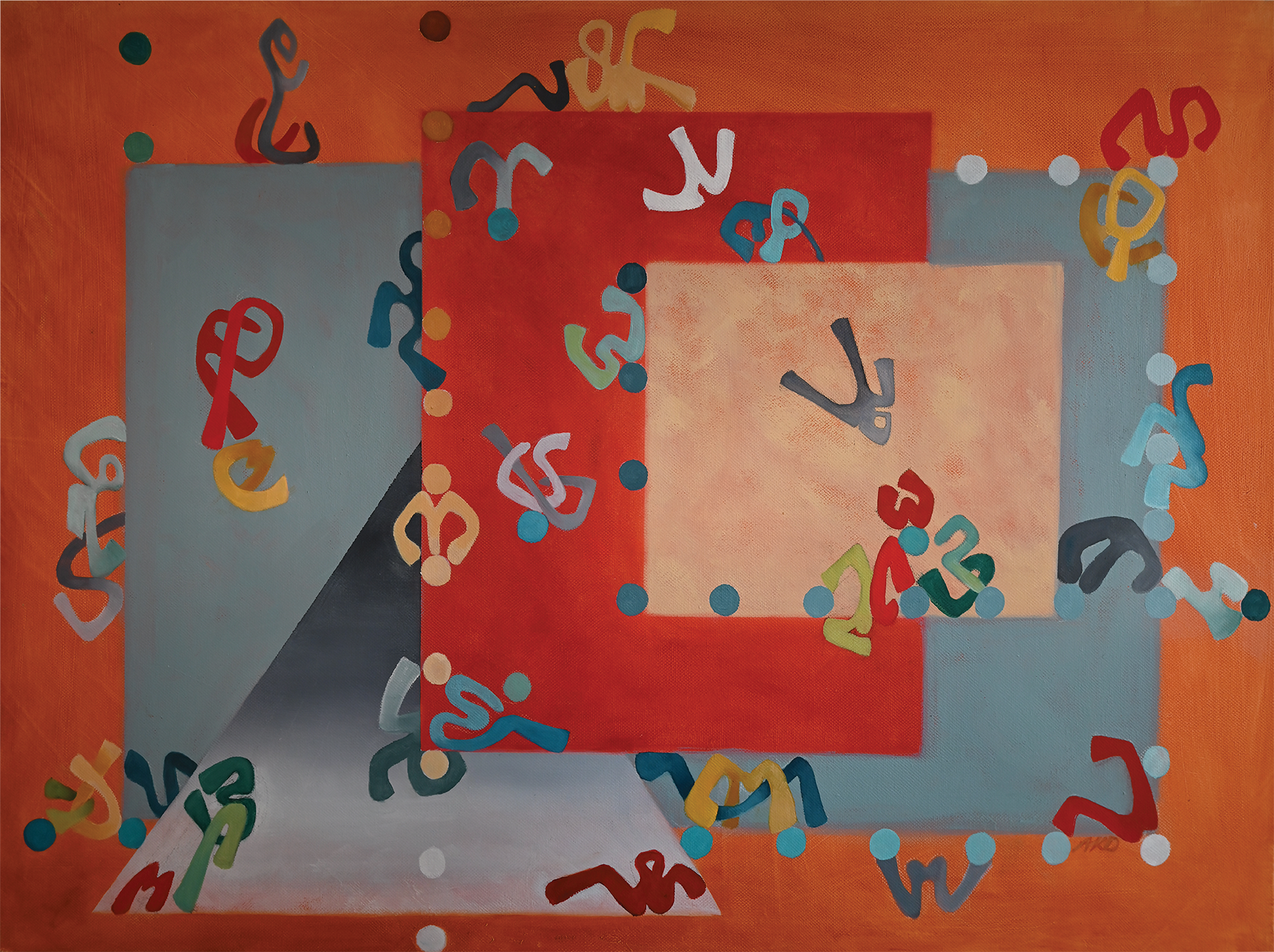 The composition is structured around various planes which provide platforms for the creatures to explore. The dots form a surface grid which creates a spatial tension between planes and dots.